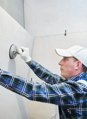 Apply a VX1 Tile Adhesive paste layer with a notched trowel to ensure even thickness and proper coverage for gluing wall tiles. Apply a coating on the substrate and large-format wall tiles to provide a long-lasting finish.